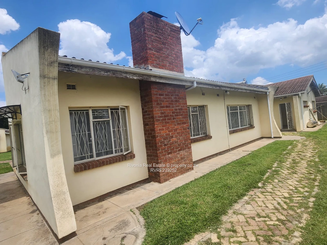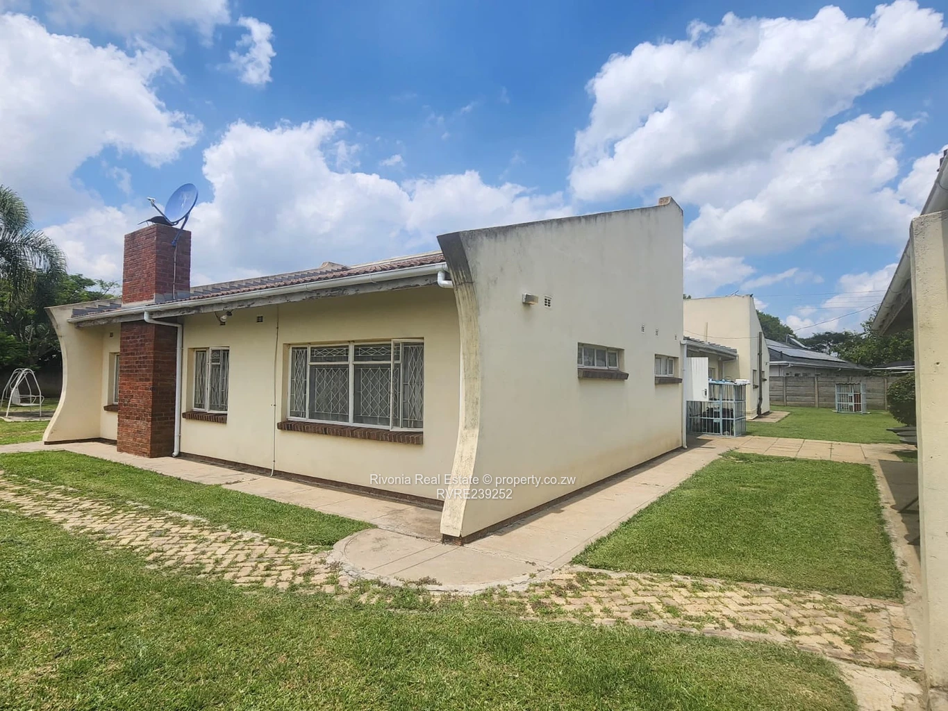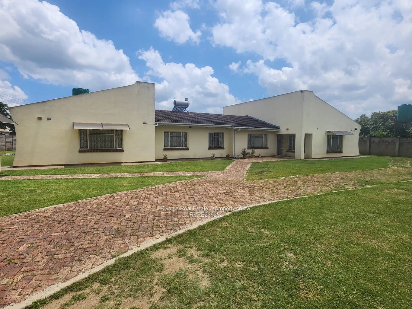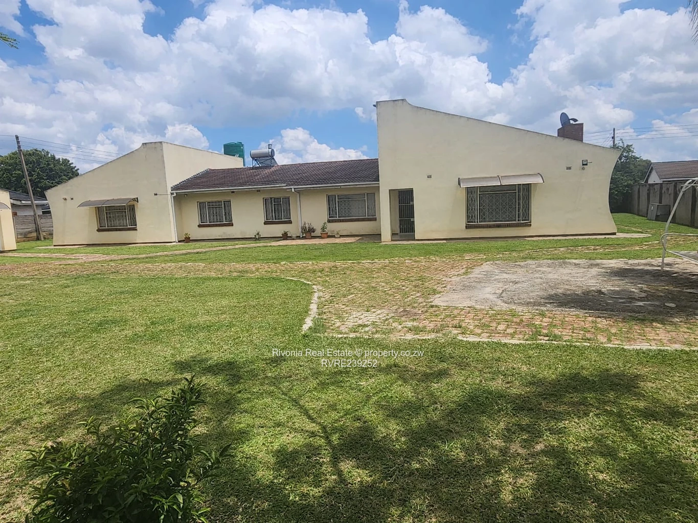 Solid family home on a generous 2,030 m² stand in sought-after Emerald Hill, Harare West. This single-storey property offers 4 bedrooms and 2 bathrooms across 305 m² of comfortable living space, set well back behind a long, paved brick driveway and expansive manicured lawns. The house presents a classic cream-rendered façade with a prominent red-brick chimney, security-barred windows, rooftop water tanks and a satellite dish visible in the photos — all signs of a practical, well-serviced family residence.